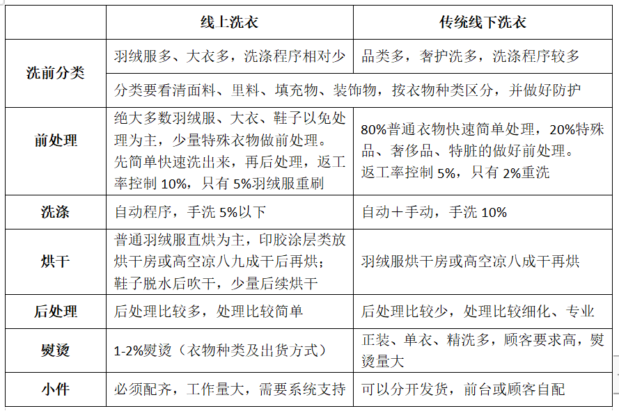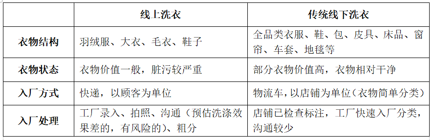 近年来各大网购平台以及挟线上流量优势的大型企业不断涌入社会化纺织品清洗市场,巨量的业务吸引着原本自身业务不足的洗衣工厂兼做或转型为线上洗衣做加工厂,但由于客群类型、定价方式、收送方式等的不同,导致衣物的种类、脏污情况、熨烫要求、客诉渠道等和传统的线下为主洗衣模式有着明显差异。